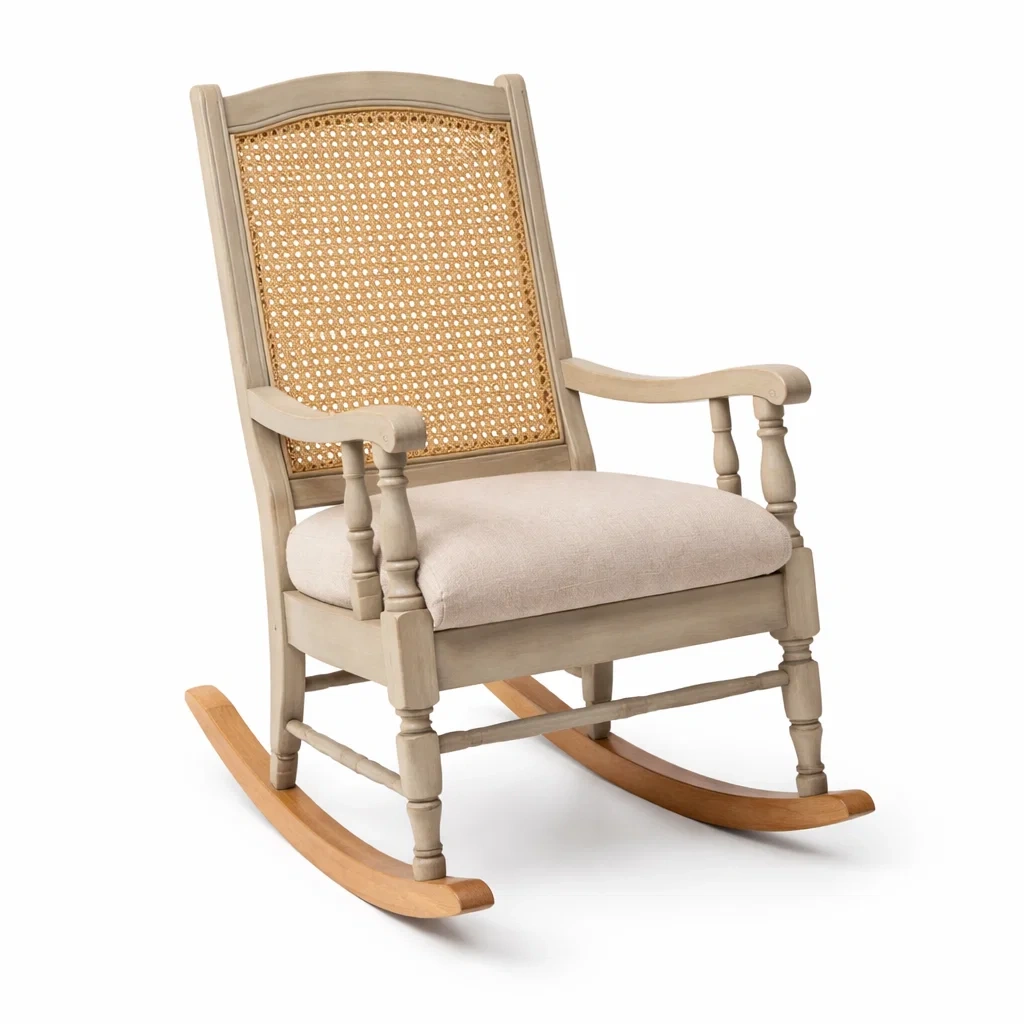 Fauteuil à bascule en bois avec cannage et coussin beige