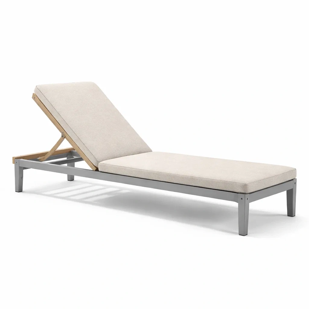 Structure principale en aluminium avec support en bois, dotée d'un coussin en tissu polyester. Le dossier peut être ajusté en plusieurs positions. Dimensions : longueur 200 cm, largeur 70 cm, hauteur 30 cm, poids total 15 kg. Finition avec revêtement en poudre et connecteurs en acier inoxydable.