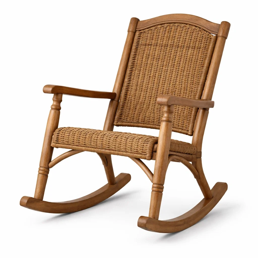 Structure en bois massif avec assise et dossier en rotin tressé.