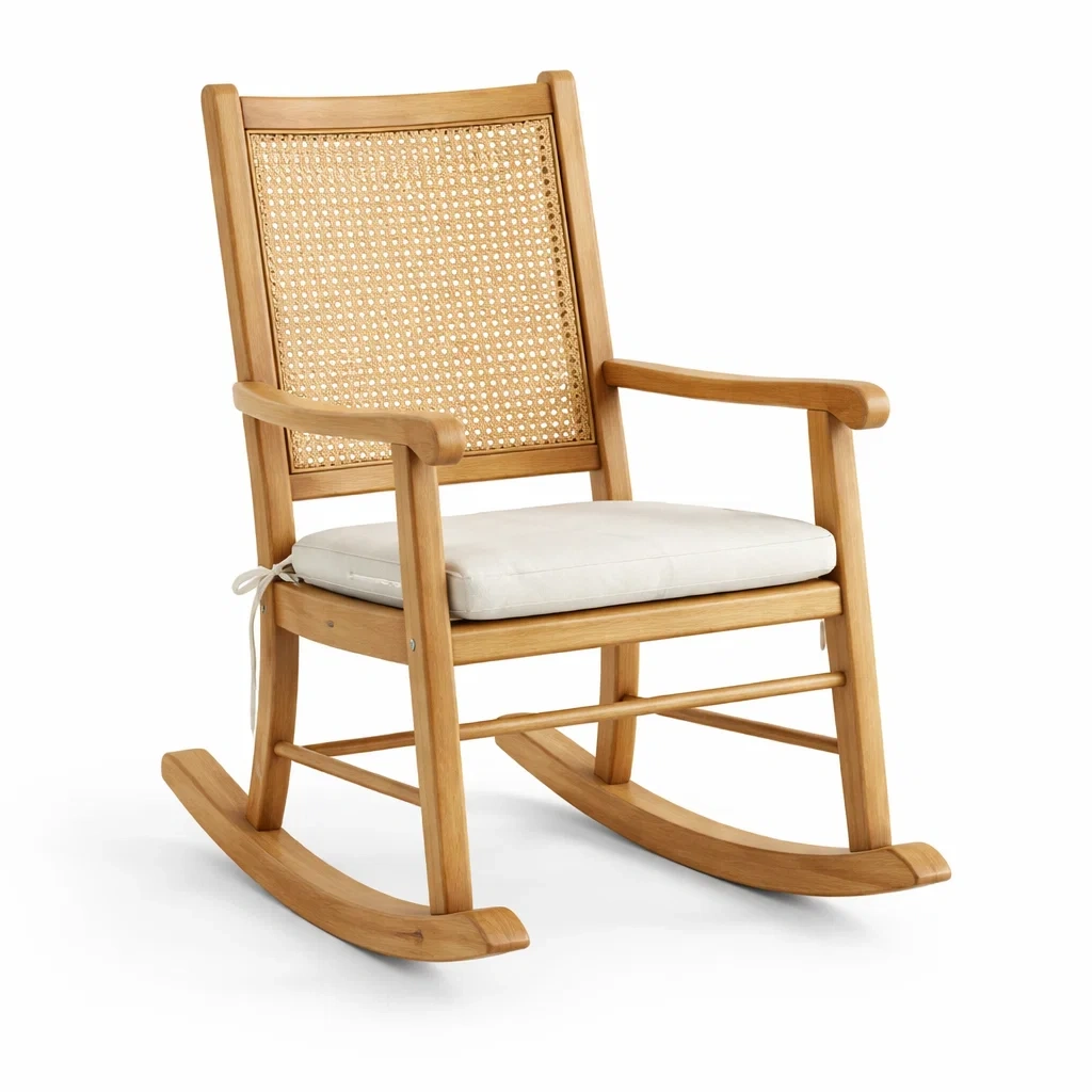 Corps principal en bois de hêtre avec un dossier en rotin. Le coussin est en tissu de lin de couleur crème.